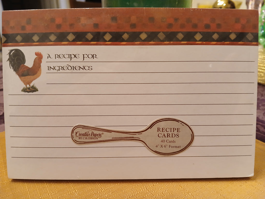 40 Recipe cards in the Chanticleer (Rooster) design that is in the 4" x 6" format.  Great way to keep those special recipes in your 3 ring binder recipe book or box.  Rooster is a traditional design that is a classic.  Sale and Seasonal items are Final sales