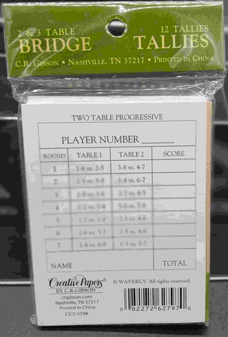 12 Stripe pattern 2 & 3 table bridge tallies in a package. Bridge tally cards are used to organize progressive bridge games and helps to speed up the scoring process and the game running smoothly. Each tally card measures 2.75" W x 3.5" H. Sale and Seasonal items are Final Sales.