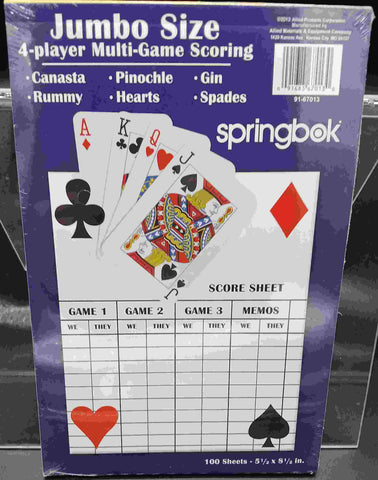 Springbok jumbo scoring sheets are scorepads designed for card games, particularly Bridge, and can also be used for other card games like Pinochle, Gin, Rummy, Hearts, and Spades. They are larger than standard scorepads, with a size of 5.5" x 8.5", and each pad contains 100 double-sided and perforated sheets. The sheets feature attractive, bold Aquatic/Bird designs and are made with sustainable, soy-based ink and recycled materials. The sheets are non-smearing and uncoated, making them practical for use during games. Sale and Seasonal items are Final Sales.